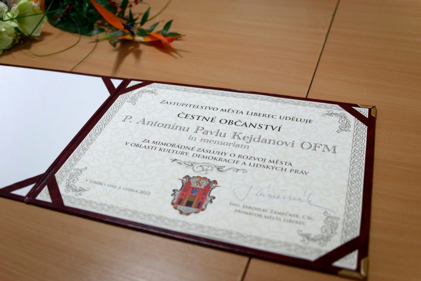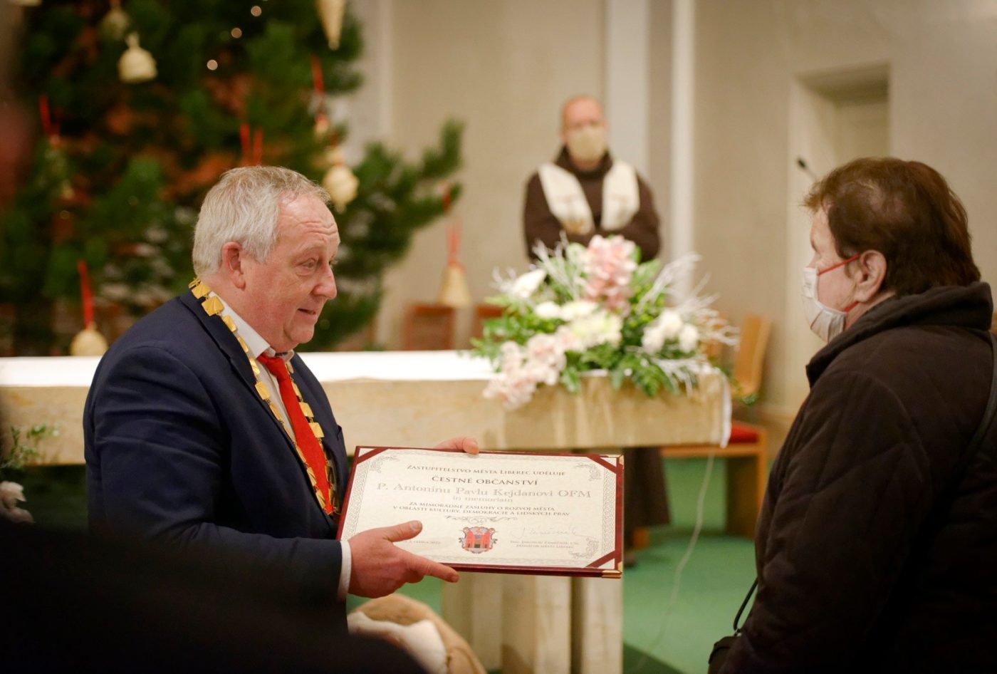 Čestné občanství předal v našem kostele primátor Liberce Jaroslav Zámečník Antonínově sestře Ludmile Chráskové. Slavnostního aktu se zúčastnila rodina Antonína, představitelé města, Libereckého kraje, františkánského řádu a mnozí další hosté. Osobní vzpomínku na bratra Antonína pronesl poslanec a zastupitel města Jan Berki.
